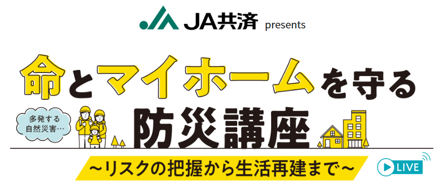 この度、JA共済さんが主催する「命とマイホームを守る防災講座」に理事長永田が登壇します。大切な家や財産を守るために普段から実践できる暮らしの備えだけでなく、イザという時に知っておきたい生活再建や支援の話までお伝えさせていただきます。LIVE中には、ご参加いただいた方からのご質問に直接お答えさせていただく時間も用意されております!