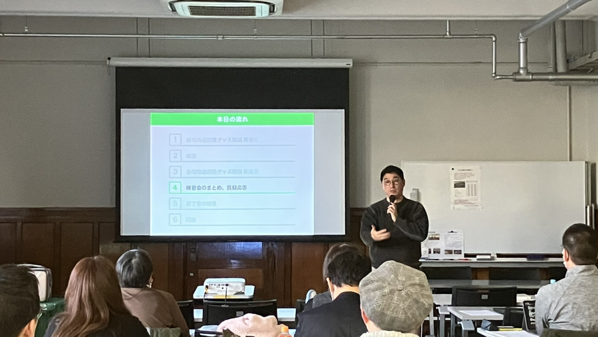 今回は、受講生が講師として、事前に割り振られた1~3つの在宅避難おすすめグッズについての発表を行い、講師がフィードバックをするという練習会を行いました。